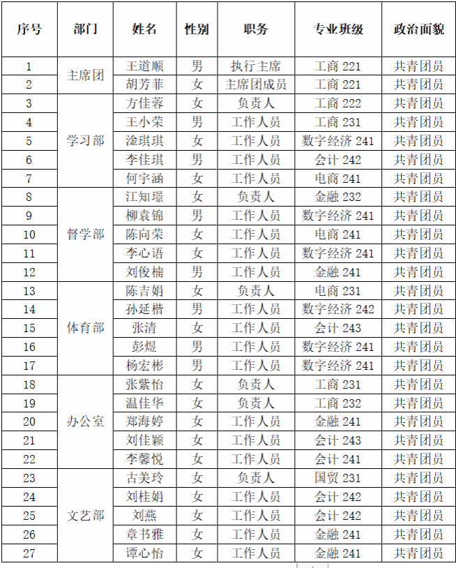 2024-2025学年beat365在线唯一官网学生会组织工作机构及工作人员公示
