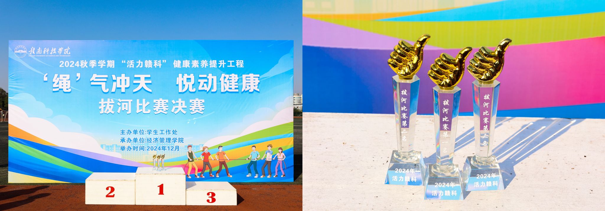 经过激烈的角逐,资源与土木工程学院参赛团队荣获第一名,智能制造与材料工程学院参赛团队荣获第二名,文法学院参赛团队荣获第三名。在欢呼雀跃声中,由学生工作处副处长黄敬宝为获奖代表颁奖。同学们纷纷表示,通过此次拔河比赛,不仅增强学院各专业同学凝聚力,更体会到团结协作的重要性。同时,也让大家在紧张学习之余,感受到体育运动带来的快乐与激情。