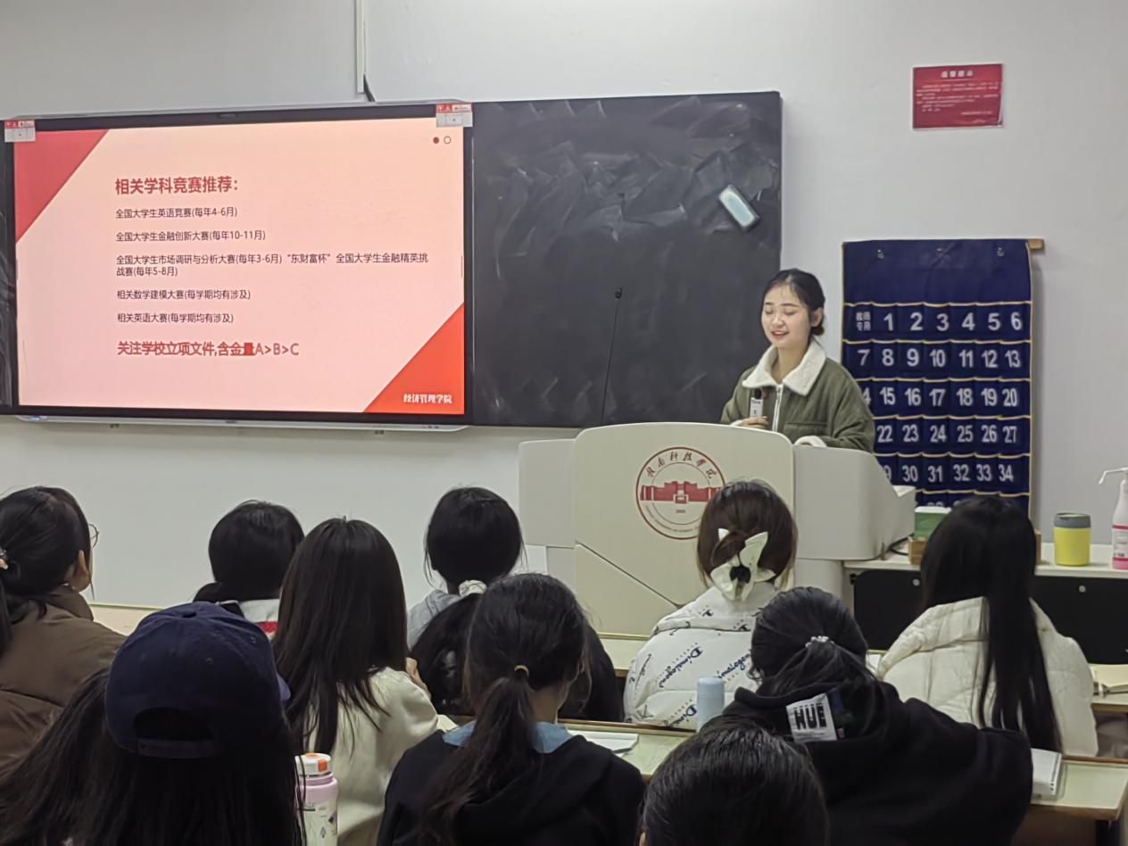 本网讯:为进一步激发同学们的学习热情,从优秀学生榜样中汲取力量,11月25日,beat365在线唯一官网举办“榜样赣科”主题宣讲活动。本次活动邀请获得2024年国家奖学金的彭龄瑶同学为大家分享自己的学习经历与感悟,2024级国贸专业全体学生参加。