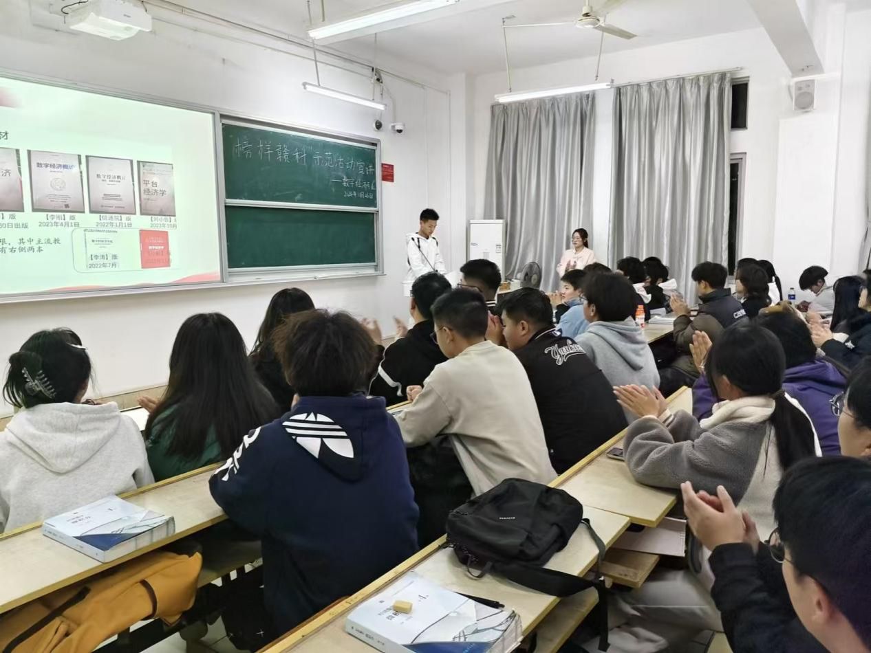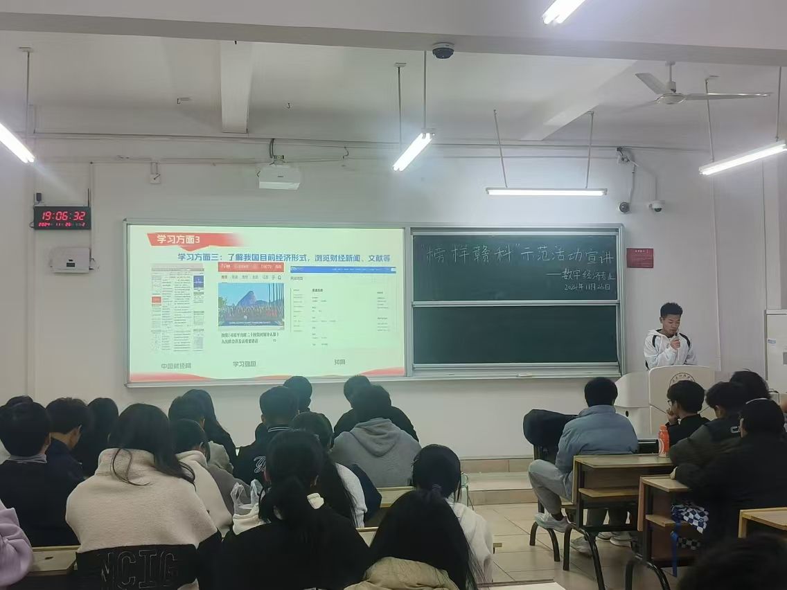 本网讯:为进一步激发同学们的学习热情,从优秀学生榜样中汲取力量,11月25日,beat365在线唯一官网举办“榜样赣科”主题宣讲活动。本次活动邀请获得2024年国家奖学金的涂传同学为大家分享自己的学习经历与感悟,2024级数字经济专业全体学生参加。