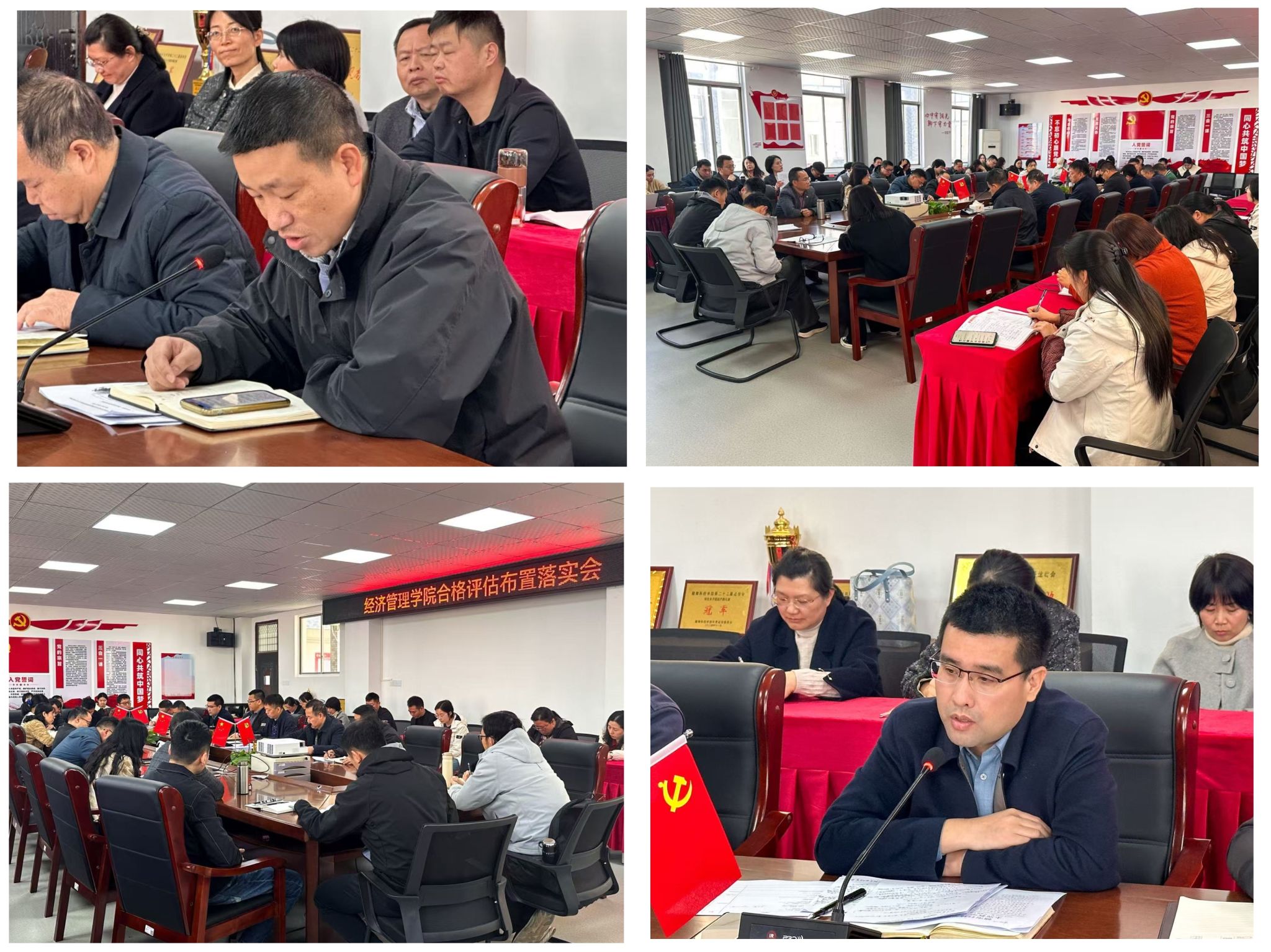 会议伊始,钟滨作动员讲话,他强调合格评估是检验办学质量的“试金石”,要求全体师生提高政治站位,以严谨作风打好迎评攻坚战。随后,梁文学围绕学工评估细化部署,他提出从学生思政、心理健康、就业指导等领域建立问题台账并制定整改措施。接着,王波对照学校诊断性评估整改方案和学校评估阶段任务,从课堂教学、教学资料、毕业论文和试卷材料等方面进行了工作布置。
