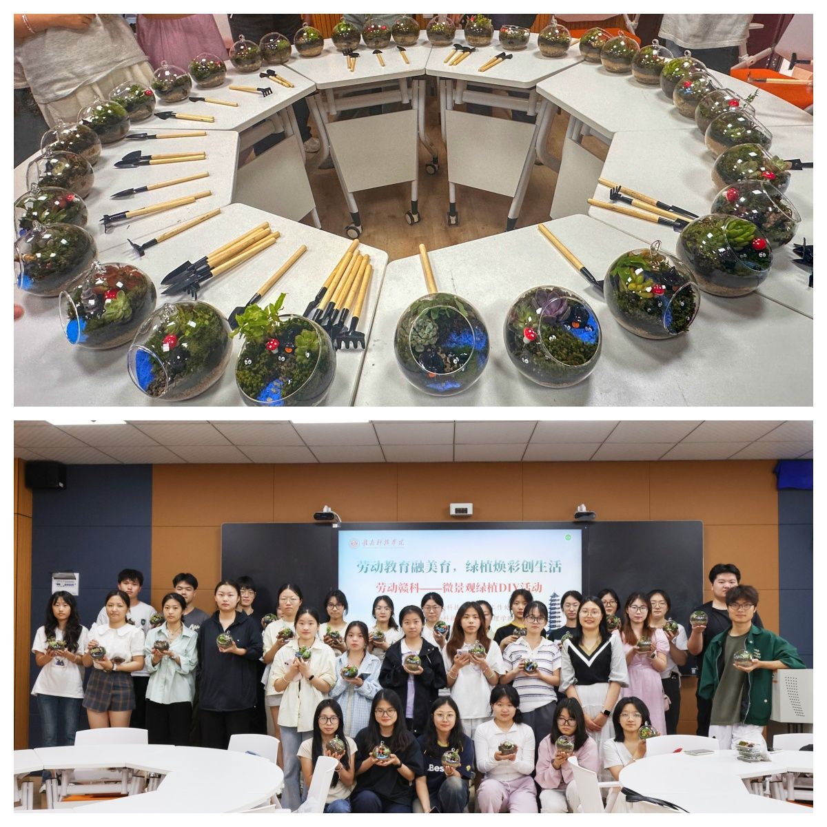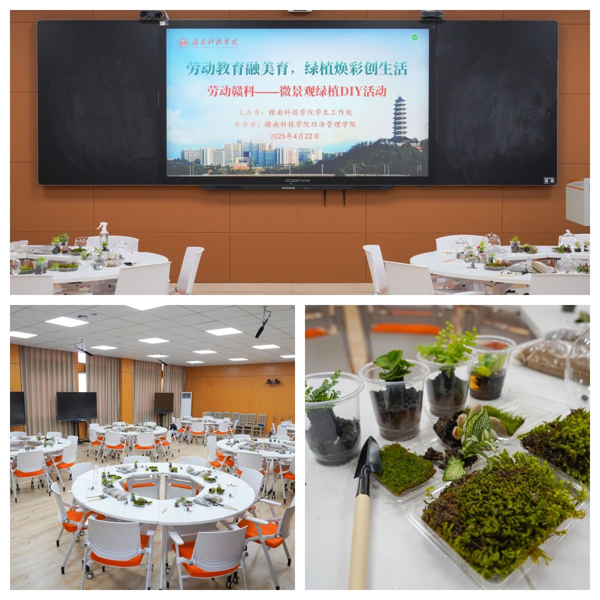 本网讯:为践行“五育并举”教育理念,促进学生全面发展,4月22日下午,beat365于崇善楼Z629教室开展“劳动赣科”大学生实践成长计划之植物微景观制作活动。学校40余名师生参与此次活动。