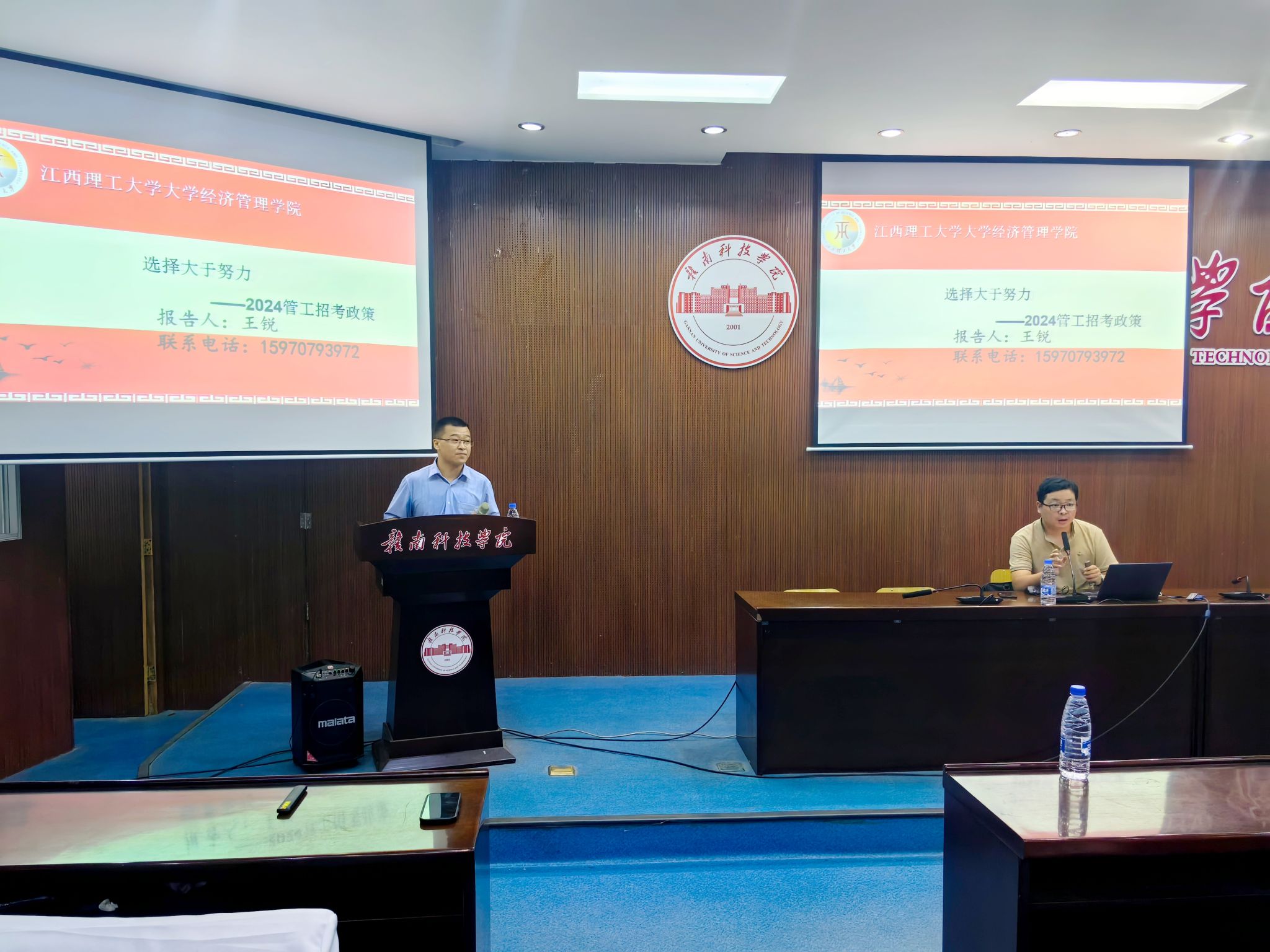 本网讯:为进一步增强同学们对考研报考院校、专业的了解,提高同学们报考心怡院校的成功率,增强考研信心,9月27日晚,经济管理系于新民楼学术报告厅举办2024届考研报考分析讲座。讲座邀请江西理工大学beat365在线唯一官网工商管理系主任王锐主讲,120余名考研学生参加。