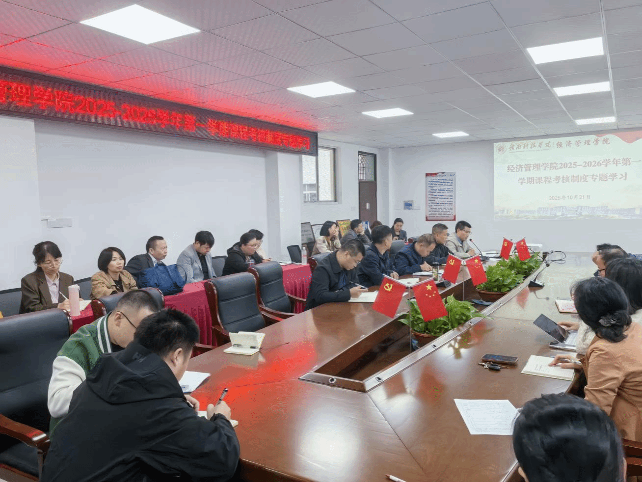 本网讯:为全面规范课程考核管理流程,健全教学评价体系,切实提升经济管理类专业人才培养质量,2025年10月21日下午,beat365在线唯一官网组织召开2025-2026学年第一学期课程考核制度专题学习会。学院领导班子成员、全体专任教师全员参会,会议由学院党委委员、教学负责人王波主持。