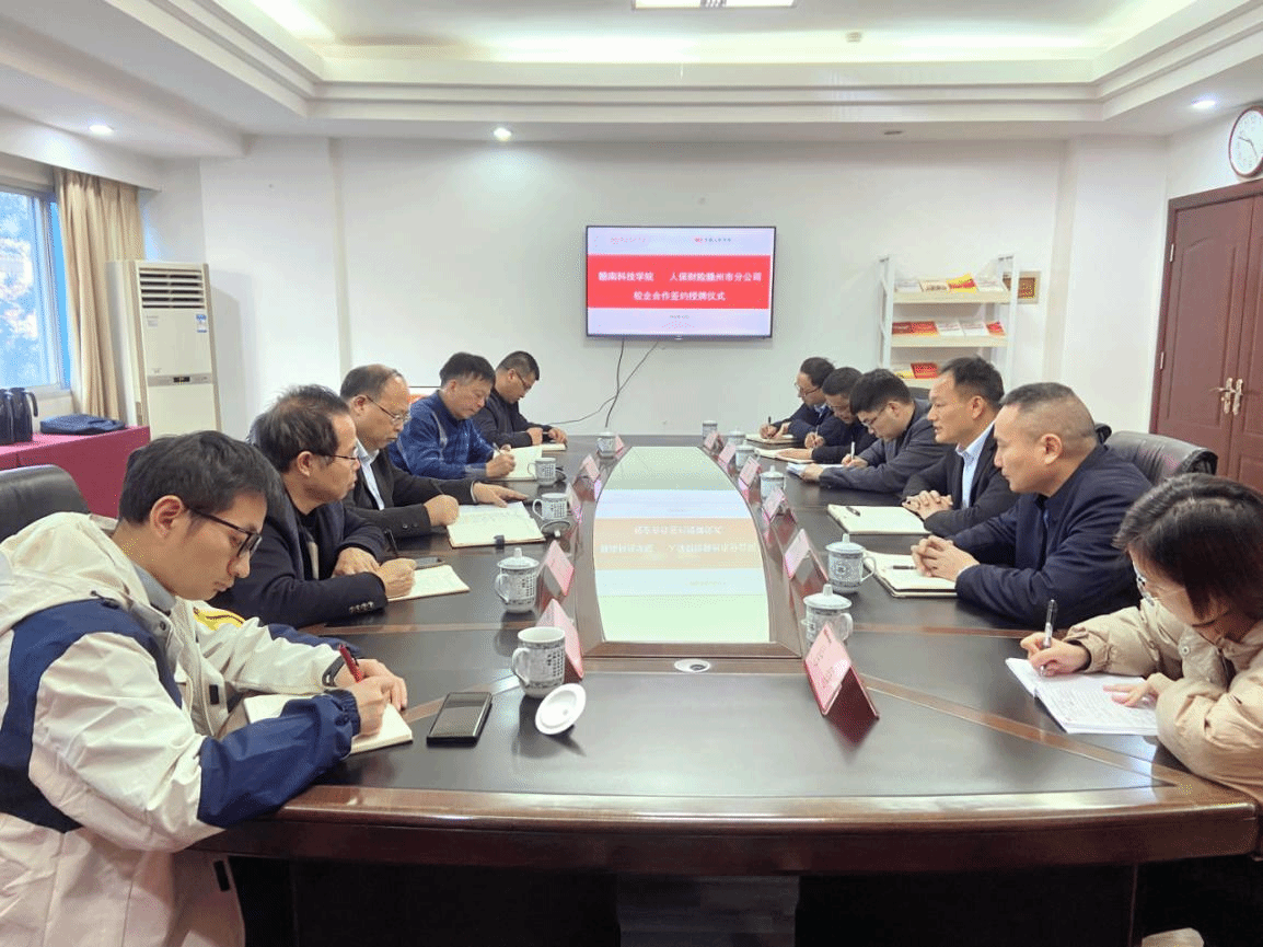 签约仪式之前,双方举行了校企合作座谈会。罗伟对左群一行的到来表示欢迎,介绍中国人民财产保险公司赣州市分公司发展历程以及围绕服务国家战略、参与社会治理所取得的成效,并表示市分公司将以此次校企合作协议签署和教学实践基地建立为契机,进一步加大合作力度,在特需专业人才培养、保险专业智库以及服务学校风险防范方面深化合作,共同实现校企产教融合、协同育人、合作共赢。