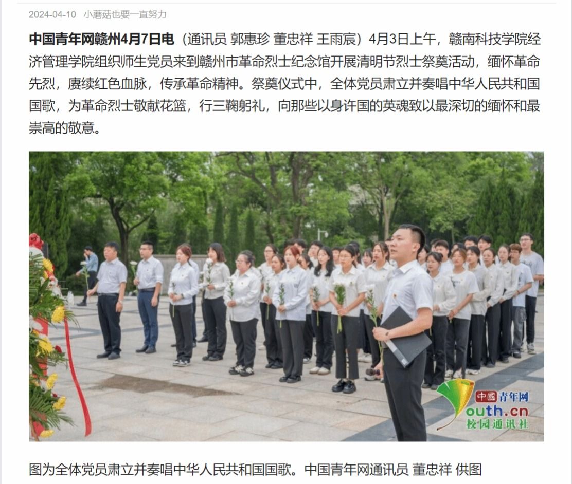 中国青年网赣州4月7日电(通讯员 郭惠珍 董忠祥 王雨宸)4月3日上午,赣南科技学院beat365在线唯一官网组织师生党员来到赣州市革命烈士纪念馆开展清明节烈士祭奠活动,缅怀革命先烈,赓续红色血脉,传承革命精神。祭奠仪式中,全体党员肃立并奏唱中华人民共和国国歌,为革命烈士敬献花篮,行三鞠躬礼,向那些以身许国的英魂致以最深切的缅怀和最崇高的敬意。